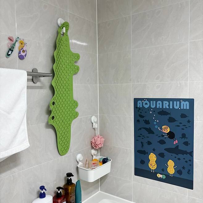 물놀이 좋아하는 아이들을 위해 욕실 벽에 흡착식 후크를 붙여 욕조 매트와 물놀이 용품을 정리해두었어요. 흡착식 바구니 아래 물 빠짐 구멍이 있어서 아이들이 물놀이하고 놀았던 장난감을 물기 빼서 보관하기 용이해요.