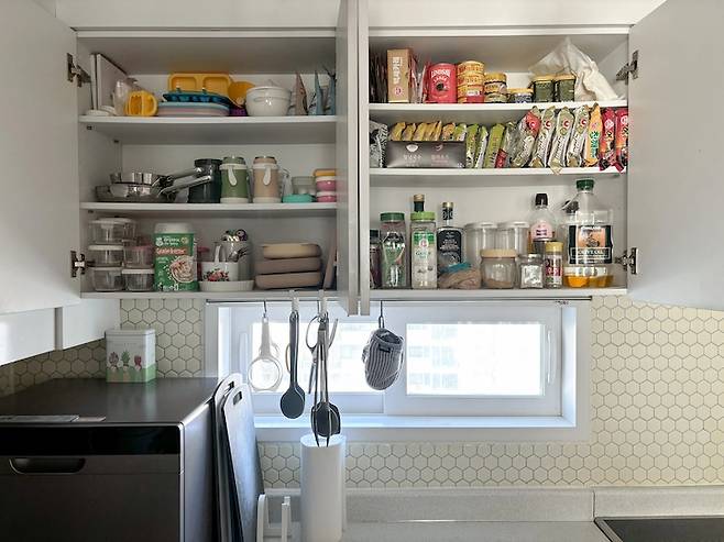 주방 타일은 붙이는 타일인 보닥 타일로 남편이 작업했어요. 요리할 수 있는 공간이 넓지 않은 주방이라 필요한 도구, 식기를 상하부장에 수납해서 꺼내 쓰고 있어요.