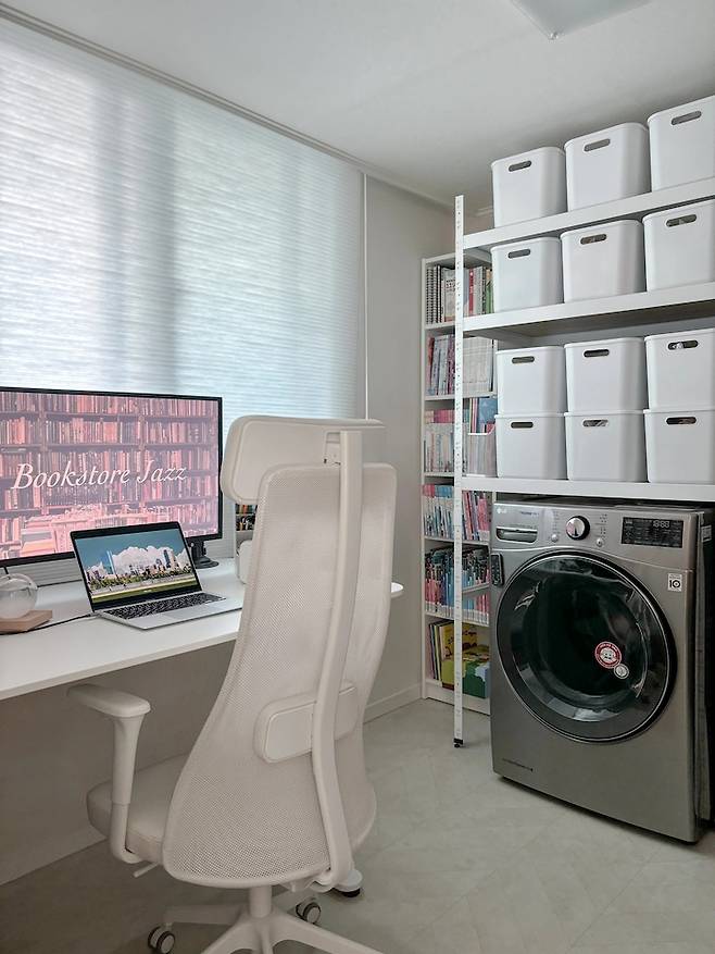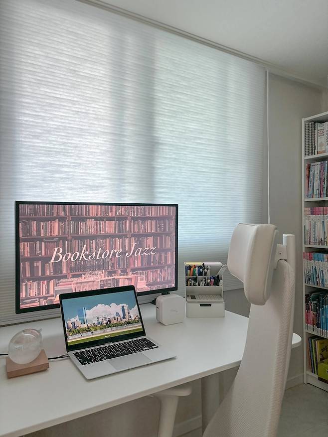 작업할때 눈이 부시지 않도록 은은하게 빛이 들어오는 블라인드를 설치했어요. 가끔 책상에서 책을 읽기도 하는데 책장과 책상의 동선이 짧아 편해요.
