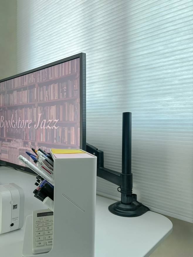 모니터 암은 남편이 알아보고 설치했는데 마치 벽걸이 TV처럼 군더더기 없이 깔끔하고 좌우, 앞뒤 어느 정도 조절하며 사용할 수 있어서 편해요.