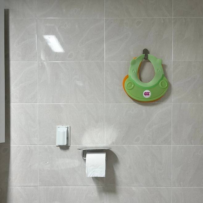 장난감 수납함 옆에는 아이 키에 맞춰 화장실 문 앞에 흡착식 후크를 부착하고 고리 수건을 걸어두어 아이 스스로 할 수 있는 환경을 만들어주었어요.