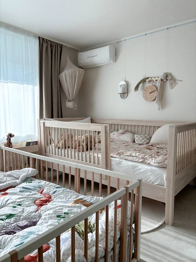 해가 잘 들어오는 방이라 원목과 화이트로 따뜻하게 꾸몄어요. 아기자기한 소품들이 있어 아이들이 좋아하는 공간이에요.