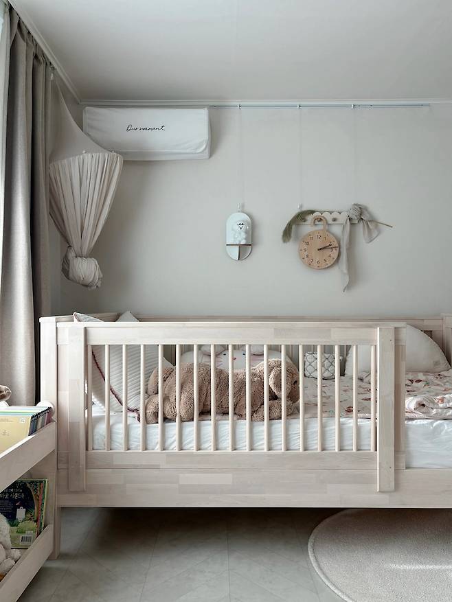 어릴 때 침대에 캐노피 다는 게 로망이었어서 아이방 분위기에 어울리는 캐노피를 머리 맡에 달아주었어요. 원래는 천장에 달게 되어있지만 커튼봉에 달았어요.