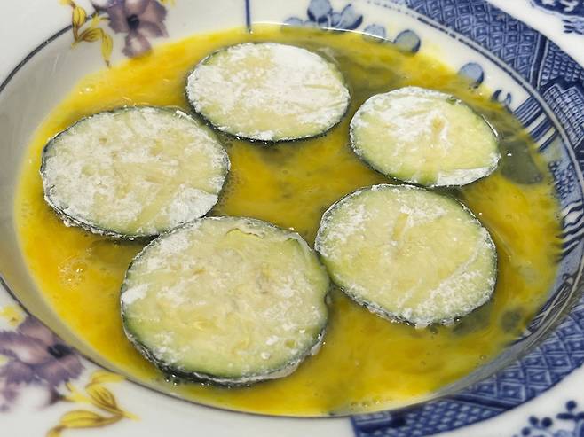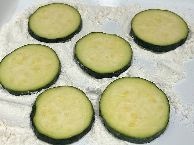 밀가루 3큰술을 덜어내고 애호박을 넣어서 가볍게 코팅해주세요. 무 두껍게 묻은 가루는 가볍게 털어내야 나중에 달걀옷이 뭉치지 않고 깔끔하게 입혀집니다. 혹은 비닐봉지에 넣어 흔들어도 쉽게 밀가루옷을 입힐 수 있습니다.