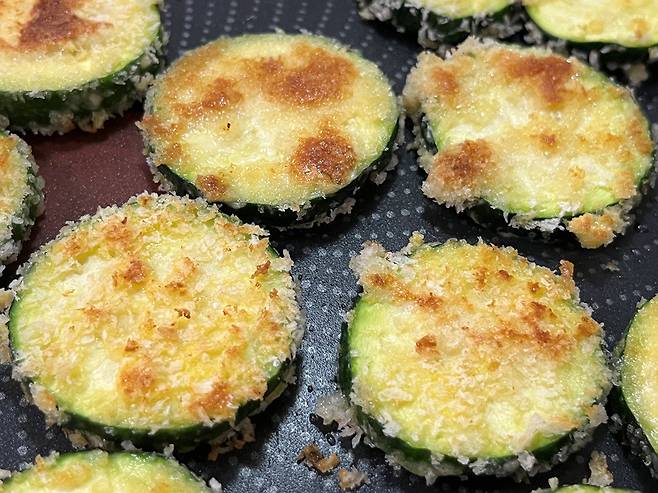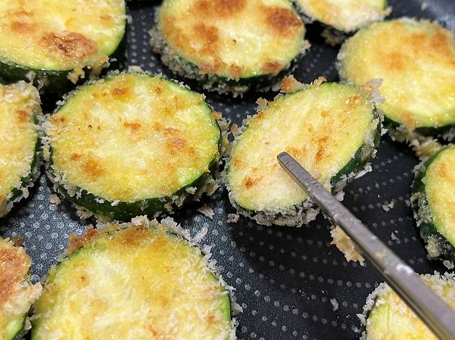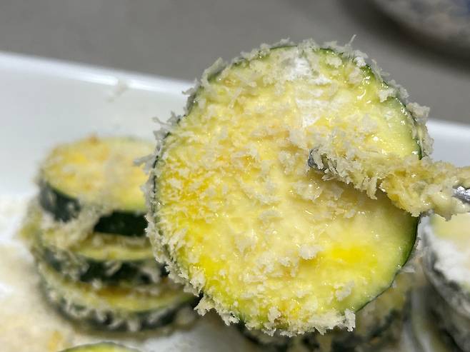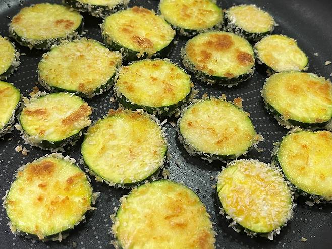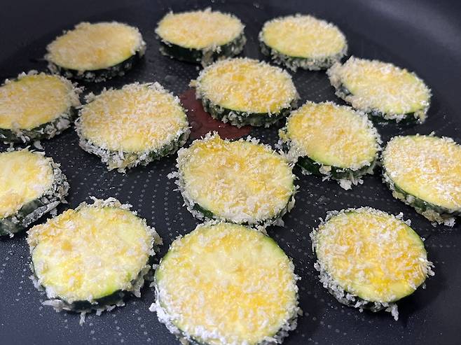 앞면이 노릇노릇하게 익어 고소한 향이 올라오면 뒤집어서 반대편도 마저 익혀줍니다. 애호박의 가장자리까지 부드럽게 익을 때까지 굽습니다.