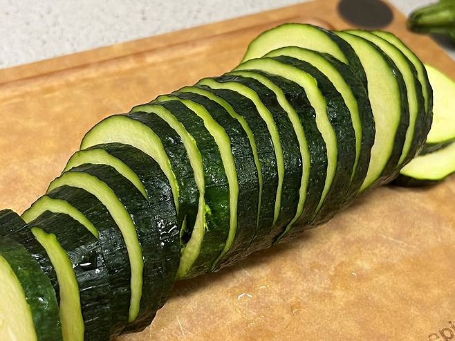 애호박 1개를 준비하여 깨끗이 씻은 뒤 약 0.5센티미터 두께로 일정하게 썰어줍니다. 너무 얇으면 씹는 맛이 없고, 너무 두꺼우면 익히는 데 시간이 오래 걸려 겉면이 탈 수 있으니 적당한 두께를 유지하는 것이 중요합니다.
