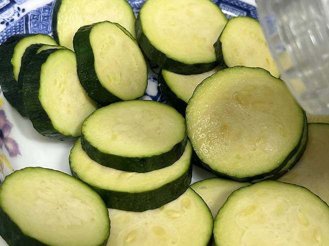 썰어놓은 애호박은 넓은 쟁반에 펼쳐두고 맛소금을 솔솔 뿌려 밑간을 해줍니다. 약 5분 정도 두면 애호박에서 수분이 살짝 올라오는데, 이때 키친타월로 가볍게 눌러 물기를 제거해야 반죽이 착 달라붙습니다.