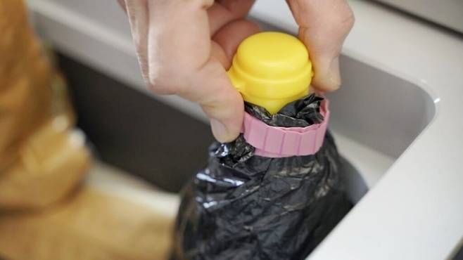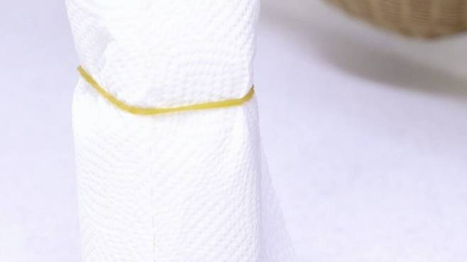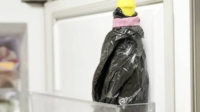 빛 차단을 확실히 하기 위해선 먼저 키친타월로 병을 돌돌 말아 주세요. 그리고 풀리지 않도록 단단히 고정시켜 놓습니다.