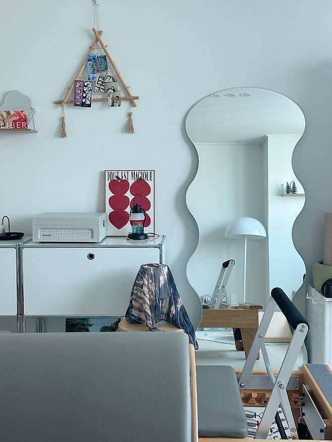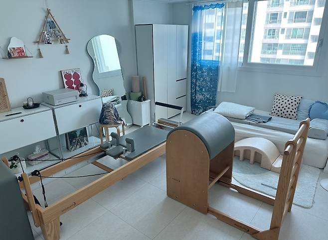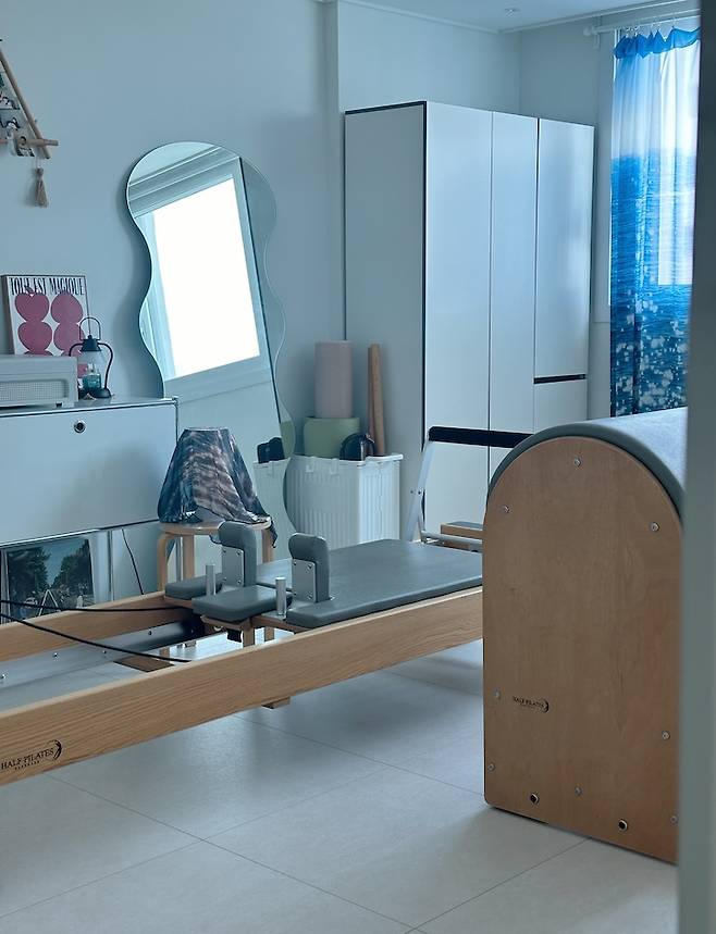 이전 집에서 쓰던 거실 가구들과 운 좋게 당근에서 득템해온 필라테스 기구들을 놓아두었더니 지금은 제법 그럴싸한 홈짐이 되었어요!