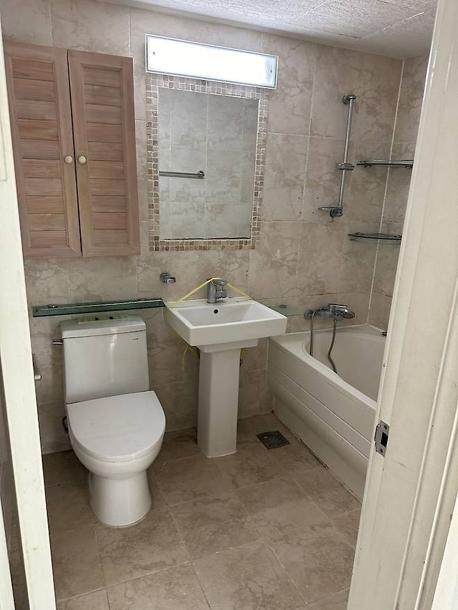 마치 어떤 중세 시대를 연상케 했던 공용 욕실은 대리석의 '느낌'만 주는 타일에 곰팡이가 가득 피어 있었고, 세면대 수도는 고장이 났는지 노끈을 묶어서 사용하고 계셨더라고요.ㅠ_ㅠ 심지어 이미 한번 타일 덧방이 된 욕실이라 다시 다 철거하고 방수 작업부터 새로 해야만 했습니다.