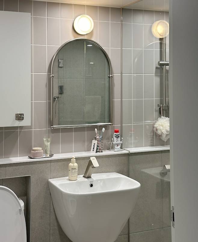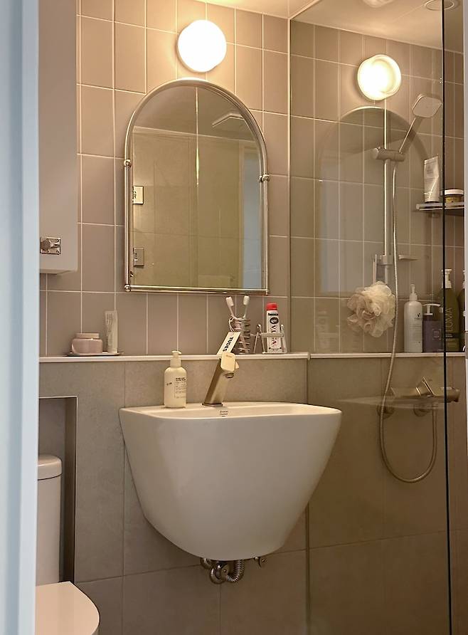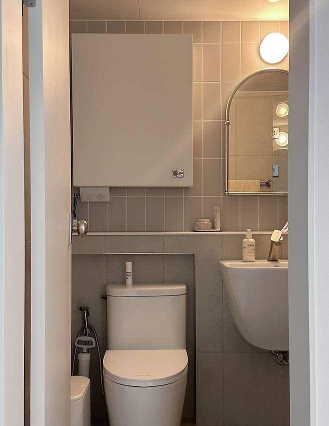 비록 요즘 핫하다는 욕실 사진들에 많이 보이는 칼각 마감까지는 할 수 없었지만, 타일과 욕실 가구, 조명, 비품 등을 아주 고심해서 골랐더니 나름 만족스러운 욕실이 된 것 같아요.😀