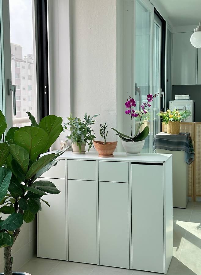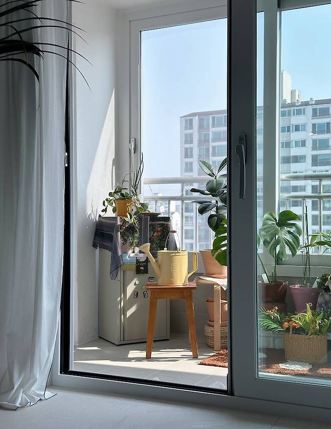 베란다가 워낙 넓어서 어떻게 활용해야 하나 아직도 고민이 많지만 일단 예전부터 키워오던 오밀조밀한 식물들에게 좀 더 양질의 햇빛과 환경을 만들어주고 있어요.