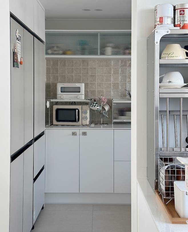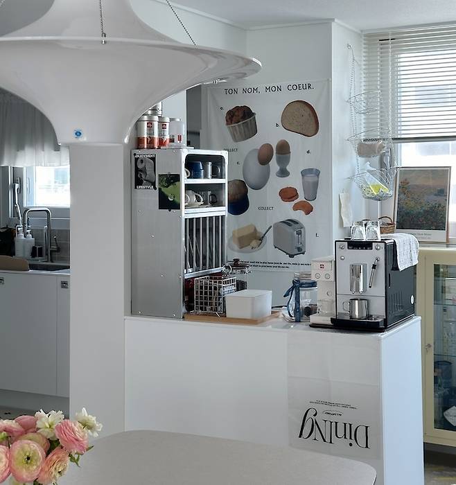 아일랜드 테이블이긴 하지만 어차피 동선이 불편해 조리대로는 사용을 못 할 것 같아서 커피 머신과 키친랙, 머그잔들을 올려두었더니 꽤 그럴듯한 홈카페존이 완성되었어요! 요즘은 아침마다 꼭 들르는 방앗간 같은 곳이 되었답니다.