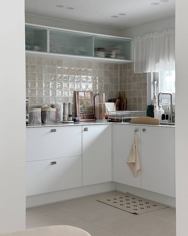 이전에 살던 집 보다 정말 좁아진 공간임에도 불구하고 저는 꼭 상부장 없는 주방을 쓰고 싶었는데요. 그렇다고 가지고 있는 그릇들을 내동댕이 칠 수도 없어서 상부장을 아예 안 할 수는 없고.. 해서 타협점을 찾은 반쪽짜리 상부장 입니다.