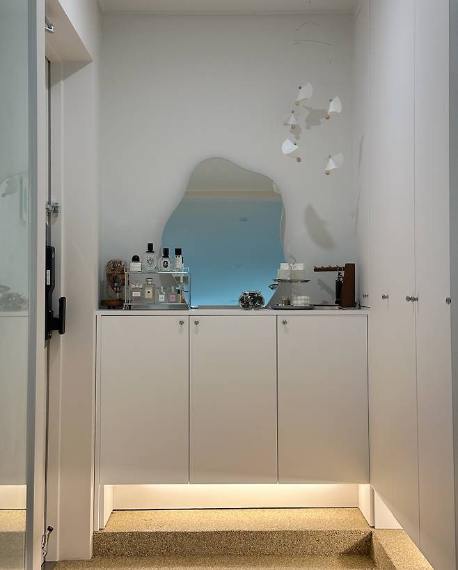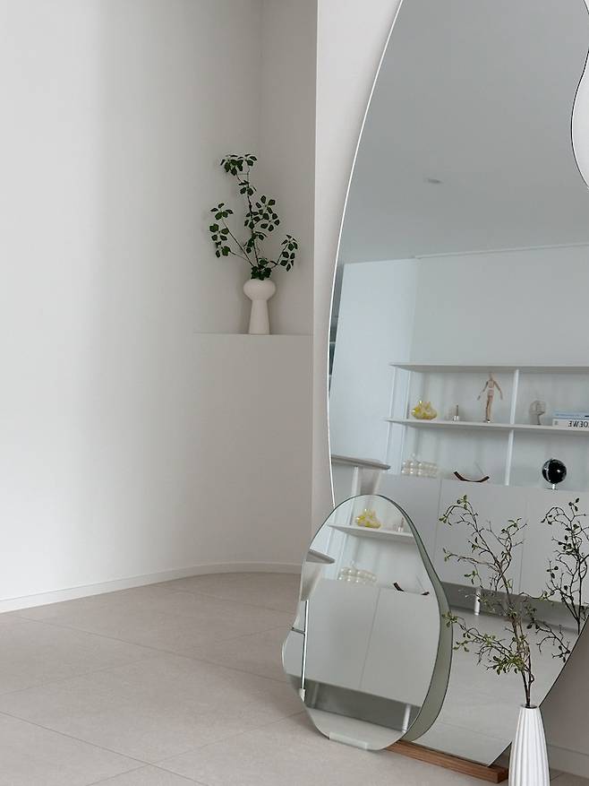 목공으로 모서리 부분을 라운드 처리해 주시고 중간에 단을 넣어주셨는데, 그 위에 포인트 조명까지 넣어주셔서 제가 그 위에 어울릴 만한 오브제로 화병을 올려두었어요. 별 건 아니지만 그래도 볼 때마다 기분이 좋더라고요.