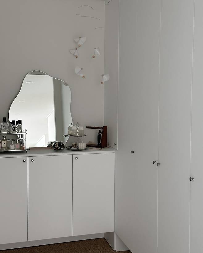 그래도 그동안에는 행거 타입의 오픈형 드레스룸만 써봐서 그런지 붙박이장으로 깔끔하게 가려두니 속이 다 시원하네요!
