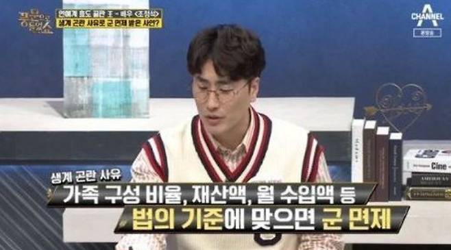 2000년, 고등학교 졸업 직후 조정석은 아버지를 잃었다. 3수 끝에 대학 진학을 꿈꾸던 그는 갑자기 가장이 되었고, 현실은 그에게 공부보다 생계를 먼저 요구했다. 당시 그의 집은 병무청 기준 재산 1300만 원 이하, 월 소득 18만 원 수준이었고 결국 그는 ‘생계 곤란’을 사유로 군 면제를 받았다. 이는 병역 기피가 아닌 정당한 면제였지만, 이후 방송 출연이 늘면서 오해와 비판이 따라붙기도 했다. 그는 “어쩔 수 없었다. 엄마랑 내가 살 방법이 그거밖에 없었다”고 솔직히 밝혔다
