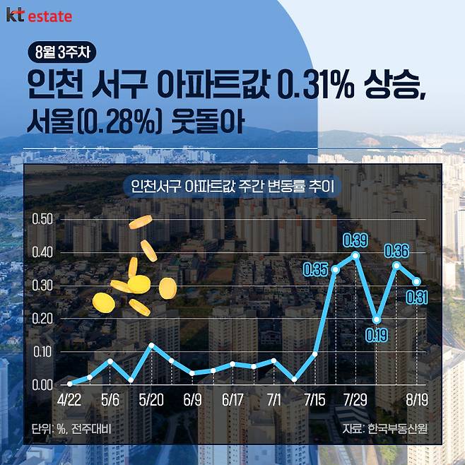 인천 서구 아파트값이 급등하고 있습니다. 한국부동산원의 ‘주간 아파트 매매가격지수’ 자료에 따르면, 8월 3주(8월 19일 기준) 서울 아파트 매매가격은 전주대비 평균 0.28% 올랐지만 같은 기간 과천과 인천 서구는 각각 0.43%, 0.31%를 기록하며 서울 상승률을 웃돌았습니다.