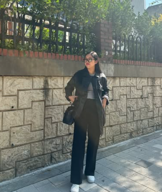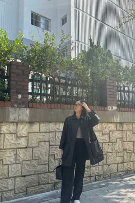하의는 블랙 슬랙스를 선택했어요. 적당히 여유 있는 핏의 슬랙스는 편안함을 챙기면서도 전체적인 룩을 세련되게 만들어주었죠.