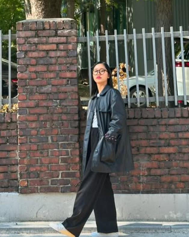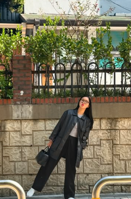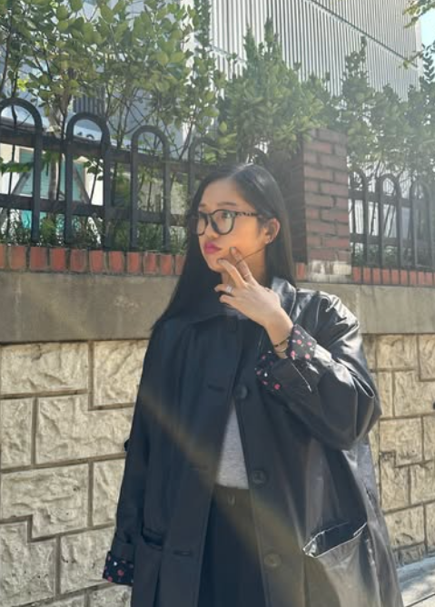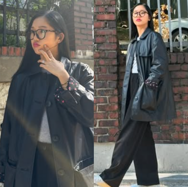 마지막으로 미미 님은 굵은 뿔테 안경을 착용해 전체 스타일링에 확실한 포인트를 주었어요. 요즘 트렌드인 레트로 무드의 뿔테 안경은 얼굴을 한층 또렷하게 보이게 해 줄 뿐만 아니라, 룩 전체에 지적인 느낌과 유니크한 분위기를 더해줘요.