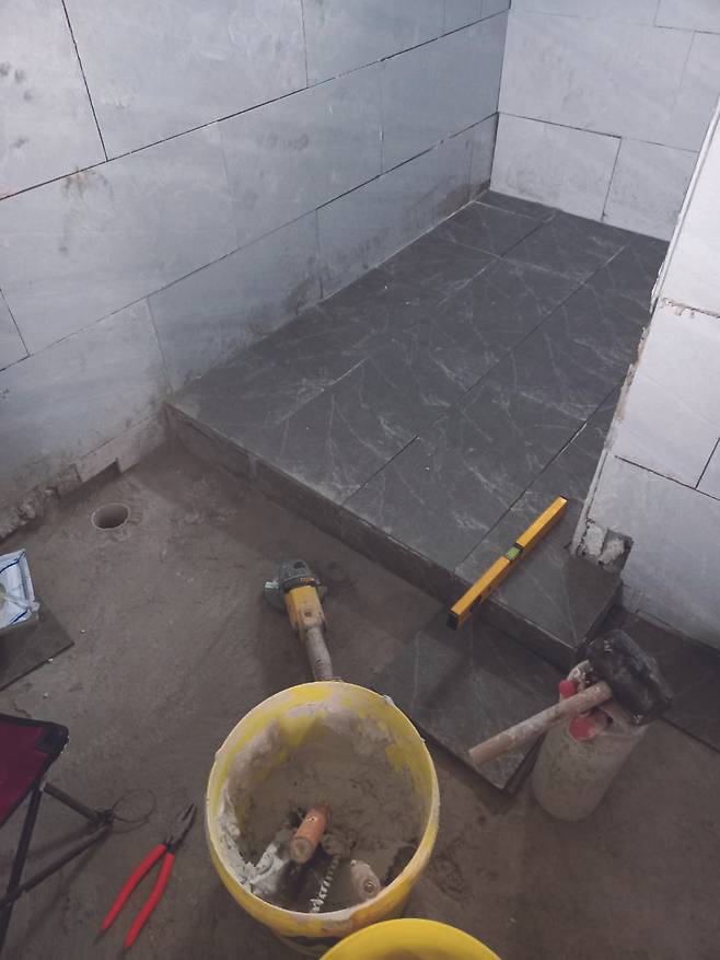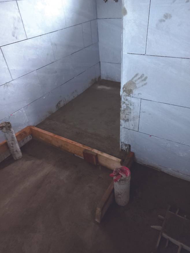 그래서 보일러실로 만들려던 공간도 화장실로 합쳤다. 문제는 보일러실로 만들려던 공간에는 기초 콘크리트가 타설돼 있어서 애초 화장실 공간과는 턱이 졌다. 화장실 안에 계단이 하나 있는 꼴이 됐다. 물론 그것도 잘 이용하면 장점이 될 수 있다. 턱이 높은 곳에 세탁기를 두고 세제 등을 두면 물이 잘 닿지 않는다. 하지만 처음부터 계획한 것이 아니라면 한 공간에 턱이 있다는 건 그리 좋은 일은 아닐 것이다. 기초공사 이후에 설계변경을 하면 바닥에 이런 일이 발생할 수도 있다. 그런 모든 가능성을 고려해 건물의 완성본을 그리고 난 뒤에 기초공사를 시작하면 좋을 것이다.