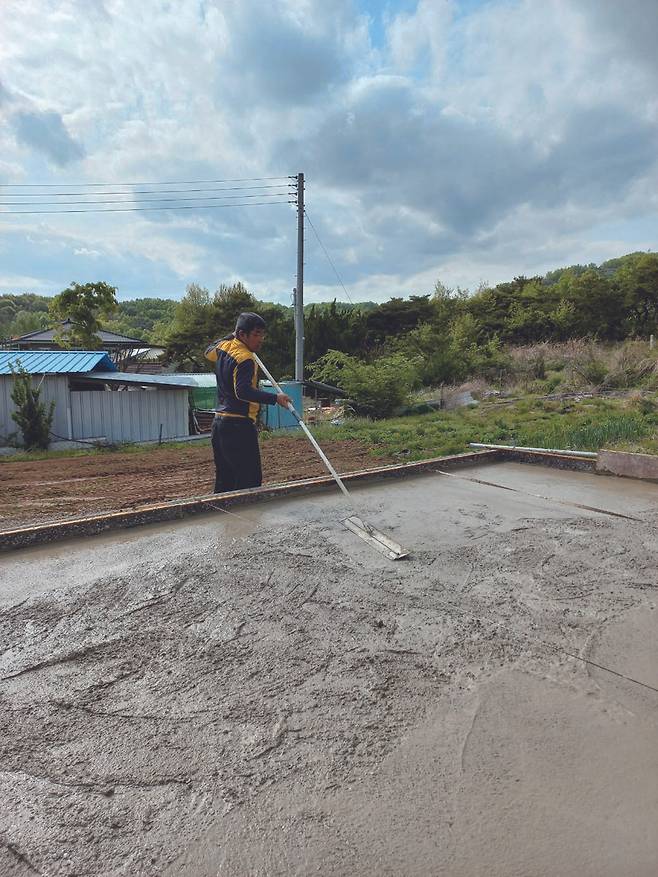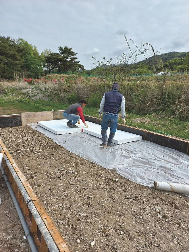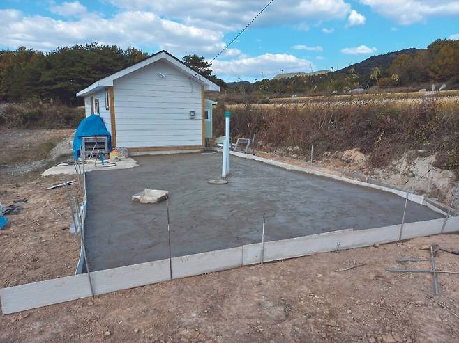 기초공사를 하고 난 뒤 또 다른 문제는 설계변경 시에 발생했다. 애초에 나는 화장실 옆 공간을 보일러실로 사용할 계획이었다. 농어촌주택 표준설계도를 참고해서 그렇게 설계했다. 그래서 기초공사 때 하수도관이 놓일 화장실 공간에는 콘크리트를 타설하지 않은 반면에 보일러실에는 타설을 했다. 그러다가 집 짓는 과정에서 좁은 집 안에 보일러실을 두면 가스 냄새로 좋지 않다는 말을 듣고는 보일러실을 집 밖에 따로 만들기로 했다.