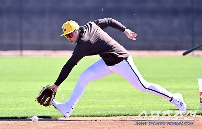 17일(한국시간) 미국 애리조나주 피오리아에서 열린 샌디에이고 파드레스의 스프링캠프 현장, 김하성이 수비훈련을 하고 있다. 피오리아(미국 애리조나)=허상욱 기자wook@sportschosun.com/2024.02.17/