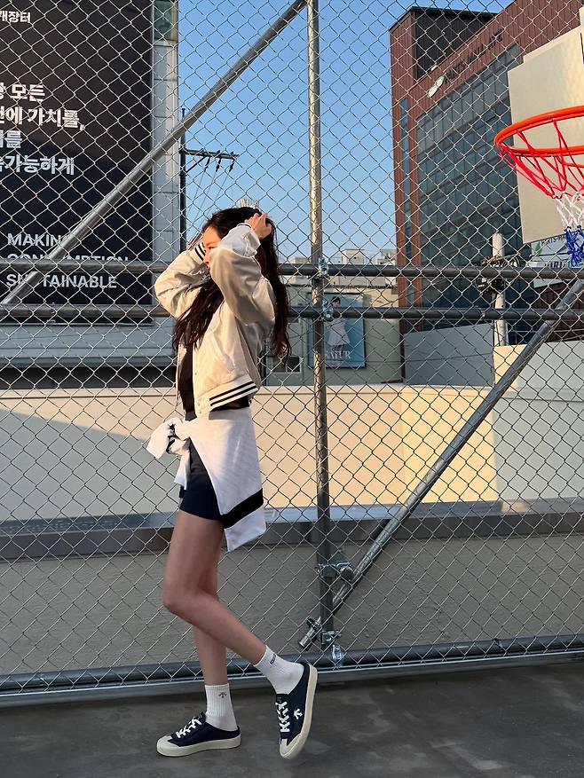 광택감 있는 화이트 스타디움 점퍼는 빛을 받으면 은은하게 반사되어 존재감을 살려주고, 짧은 팬츠와의 조합은 활동성과 시원한 실루엣을 동시에 표현해줬어요.