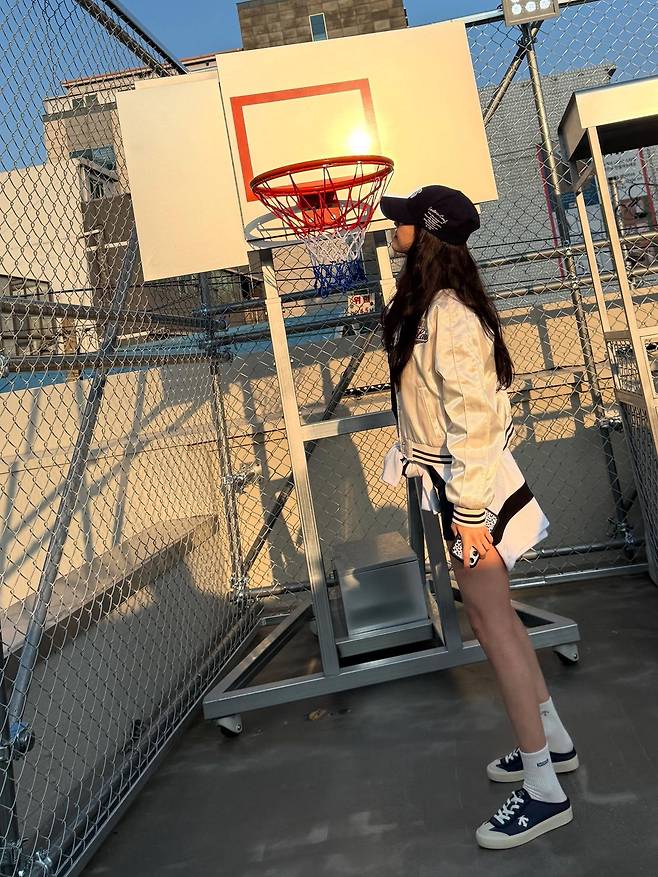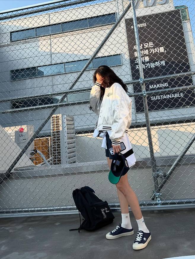 여기에 블루 로우탑 스니커즈와 발랄한 삭스 조합은 자연스레 시선을 아래로 이어주며, 야구 모자와 백팩으로 마무리한 룩은 손나은 특유의 캐주얼하면서도 정제된 매력을 잘 보여줬어요.