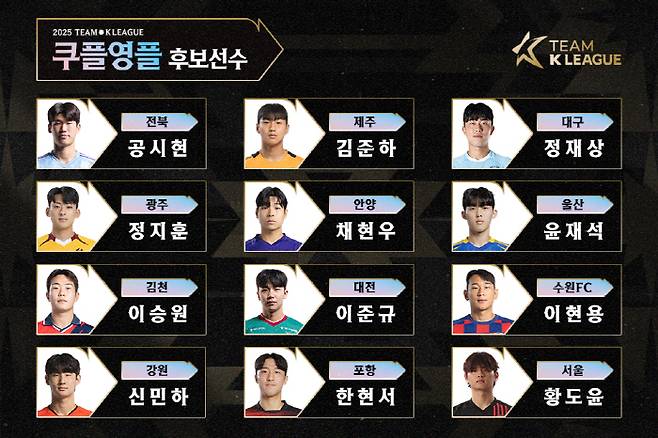 올해 후보는 신민하(강원), 정지훈(광주), 이승원(김천), 정재상(대구), 이준규(대전), 황도윤(서울), 이현용(수원FC), 채현우(안양), 윤재석(울산), 공시현(전북), 김준하(제주), 한현서(포항)다. 이 중 팬들의 선택을 받은 1명의 선수가 '쿠플영플' 자격으로 팀 K리그 소속으로 쿠팡플레이 시리즈에 출전할 자격을 얻는다.