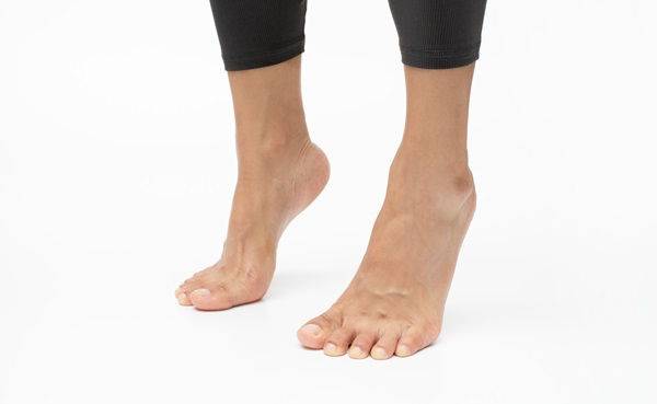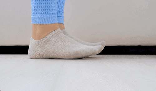 바닥에 똑바로 선 자세에서 양발을 어깨너비로 벌립니다. 두 발꿈치를 동시에 들어 올려 까치발로 섭니다. 발꿈치를 내리며 원래 자세로 돌아옵니다.
