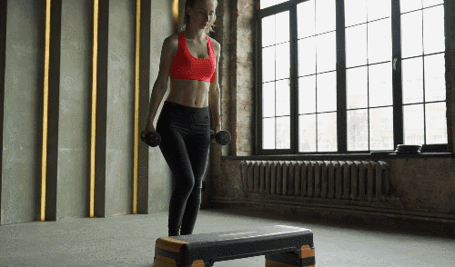손에 아령이나 생수병을 들고 팔을 자연스럽게 아래로 내린 채 준비합니다. 스텝박스나 낮은 계단 앞에 똑바로 서세요. 오른발을 먼저 스텝박스에 올린 후 왼발을 올립니다. 다시 오른발부터 내려오고, 이어서 왼발을 바닥에 내립니다.