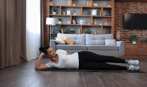 매트에 오른쪽 옆구리를 대고 눕습니다. 오른팔은 팔꿈치를 굽혀 머리를 받쳐 지지합니다. 왼손은 가슴 앞 바닥에 가볍게 대어 몸의 균형을 잡습니다. 왼쪽 다리를 공중으로 들어 올린 후, 다시 내립니다. 이 동작을 반복한 후, 반대편으로 누워서 오른쪽 다리로 운동합니다.