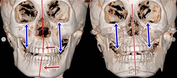 얼굴의 중심축이 휘어서 턱끝이 한쪽으로 돌아가있고 입꼬리의 높이가 다른 안면비대칭의 경우 미용적인 문제 뿐 아니라 기능적인 문제가 있기 때문에 반드시 근본적인 해결방법인 양악술을 받기를 추천한다.