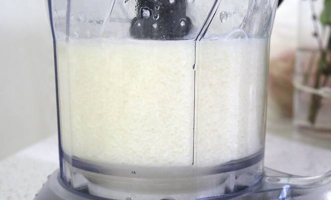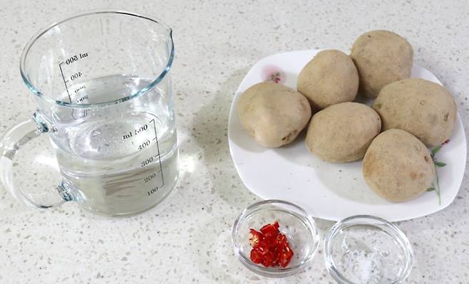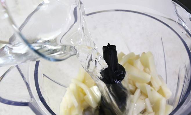 감자는 껍질을 벗겨 적당한 크기로 잘라준 뒤 믹서기에 감자와 물 2컵을 넣고 곱게 갈아주세요.
