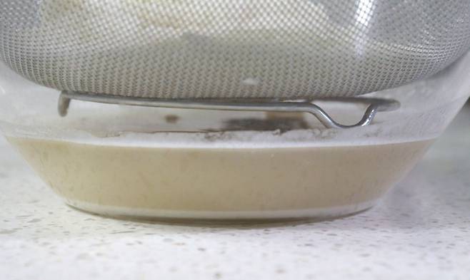 물에서 분리된 전분이 가라앉으면 물을 따라내고 전분만 남겨주세요.