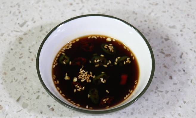 전분물이 분리되는 동안 양념장을 만들어요. 진간장 3숟가락, 식초 1숟가락, 청양고추를 썰어 넣고, 깨소금을 뿌려주세요.