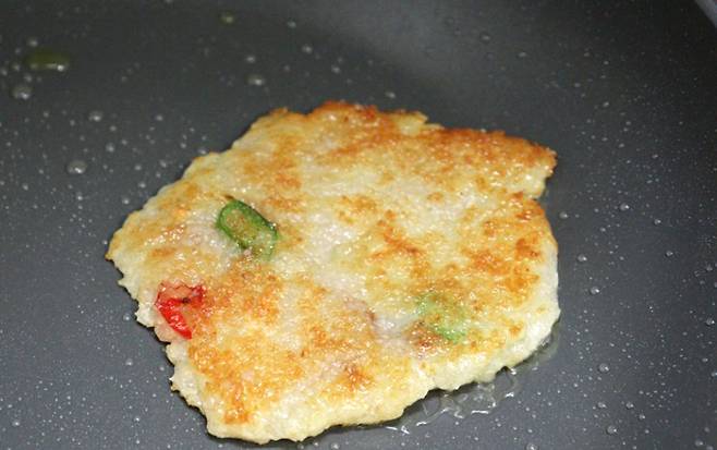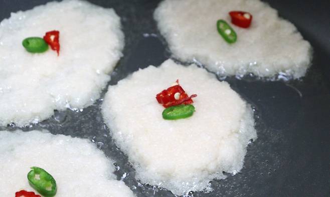 팬에 식용유를 넉넉히 두르고 중불에서 팬을 달군 후 반죽을 한 국자씩 올려서 익혀줍니다. 고명으로 청양고추나 홍고추를 넣어 색감을 더해줘요.