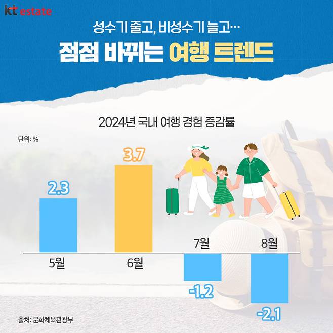 또한, 문화체육관광부 ‘2024 국민여행조사’에 따르면, 2024년 5월과 6월 국내 여행 경험률은 전년과 비교해 각각 2.3%, 3.7% 증가한 반면, 전통적 성수기인 7월과 8월에는 오히려 1.2%, 2.1% 감소했다고 밝혔습니다. 이를 봤을 때 최근 여행자들은 무더위와 북적이는 인파를 피해 얼리 바캉스를 선택하는 것으로 분석됩니다.