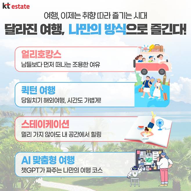 무엇보다 업계에서는 이제 여행이 일상화되면서 더 다채로운 트렌드가 나타날 것으로 예측하고 있는데요. 최근에는 당일치기 해외여행을 뜻하는 ‘퀵턴 여행’이 뜨고 있고, 혼자만의 힐링을 즐기는 ‘스테이케이션’, 그리고 AI 맞춤형 패키지나 친환경 여행 등 취향에 따라 여행 트렌드가 점차 세분화되고 있습니다.