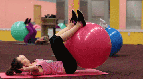 매트에 등을 대고 눕습니다. 다리를 짐볼 위에 올립니다. 다리를 공중으로 들어 짐볼을 잡고 버팁니다. 상체를 일으켰다가 내리면서 복부를 자극합니다. 이 동작을 반복하세요.