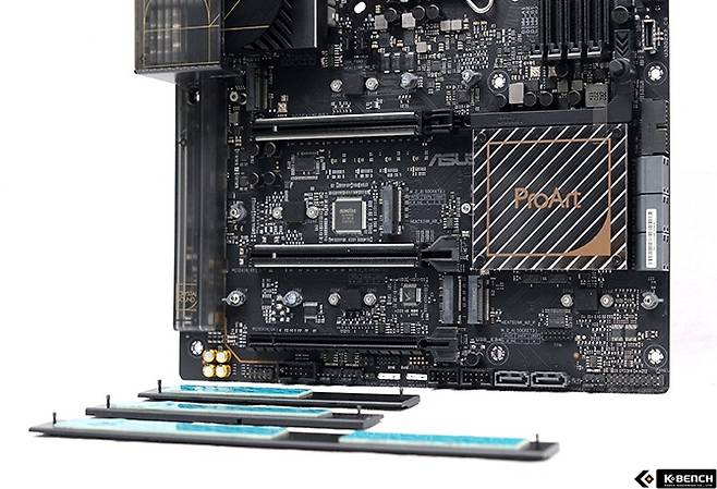ASUS ProArt Z790-CREATOR WIFI에는 총 4개의 M.2 슬롯이 제공된다. 이 슬롯 모두는 PCIe 4.0 x4 Lane 조합이며 첫 번째 슬롯은 CPU로 직결되고 나머지 3개 슬롯은 Z790 칩셋을 통해 CPU로 데이터를 전달하는 구조로 설계됐다.