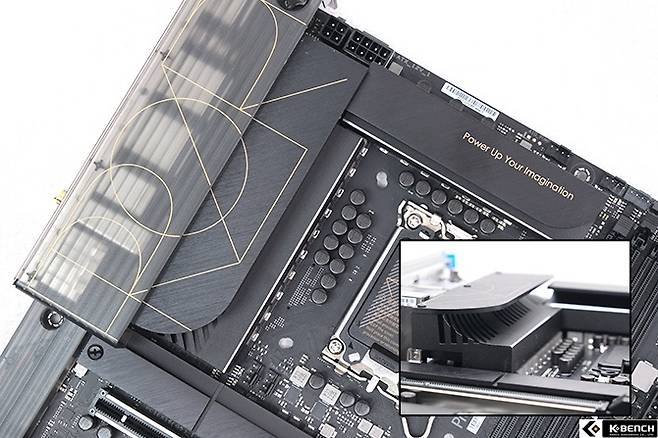 먼저, 전원부는 16+1 페이지의 팀드 구조가 적용됐고 개별 MOSFET의 최고 출력도 70A로 13세대 코어 프로세서나 앞으로 출시된 14세대 코어를 소화하기에 충분하다. 전원부 VRM은 당연힌 DiGi+ 모듈이며 CPU 보조 전원 커넥터도 프로쿨 II를 적용하여 저항을 낮췄다. 이렇게 하면 과열로 인한 커넥터 손상을 방지할 수 있다.