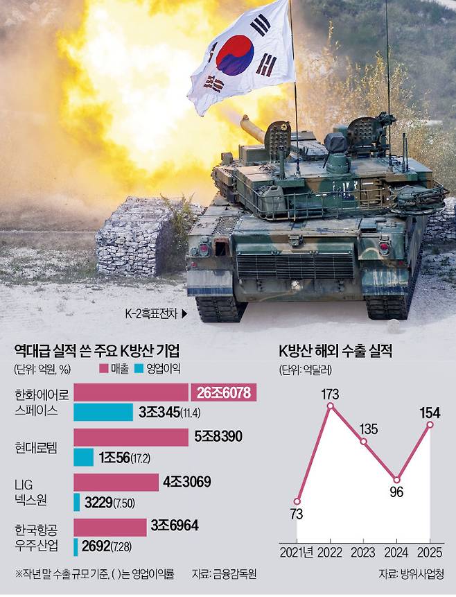 최근 중동발(發) 리스크가 커지며 주가가 조정받은 K방위산업주를 다시 주목해야 한다는 분석이 나왔다. 올해 K방산 기업의 수출 규모가 유럽의 재무장 기조와 중동 시장 확대에 힘입어 역대급에 달할 것으로 예상되면서다. 증권가에선 올해 방산 수출이 56조6000억원(약 377억달러)에 달할 것이란 분석까지 나왔다.
