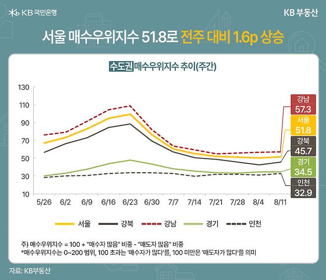 서울은 강북(45.7)이 3.0p 반등하며 하락세를 멈췄고, 강남(57.3)도 3주 연속 상승했지만, 거래가 폭발적으로 늘어난 상황은 아닙니다.