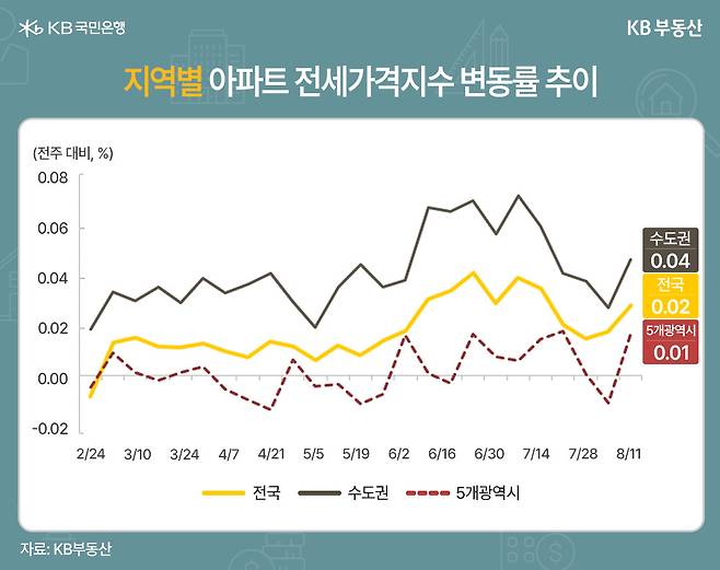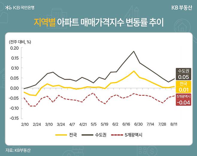 KB부동산에 따르면 이번 주(8월 2주) 전국 아파트 매매가격은 전주 보합에서 0.01% 상승하며 소폭 반등했습니다. 7월 말부터 이어진 보합세를 끊고 다시 오름세로 돌아선 건데요.