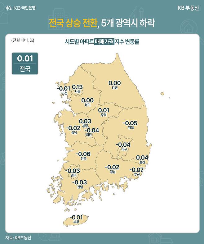 다만 5개 광역시는 여전히 -0.04%로 하락세를 이어갔습니다. 울산(0.04%)만 24주 연속 상승했고, 광주(-0.03%), 대전(-0.04%), 대구(-0.04%), 부산(-0.07%)은 하락했습니다.