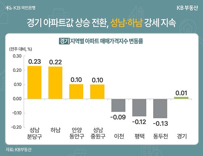 경기 아파트값은 0.01%로 상승 전환했습니다. 성남 분당구(0.23%), 하남시(0.22%)가 강세를 이어갔고, 안양 동안구·성남 중원구도 상승했습니다. 분당은 1기 신도시 선도지구 기대감이, 하남은 학군과 생활편의 인프라가 뒷받침된 수요층 덕분에 강세를 이어갔습니다.