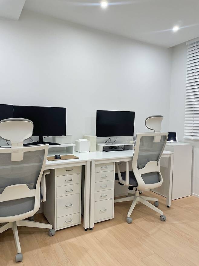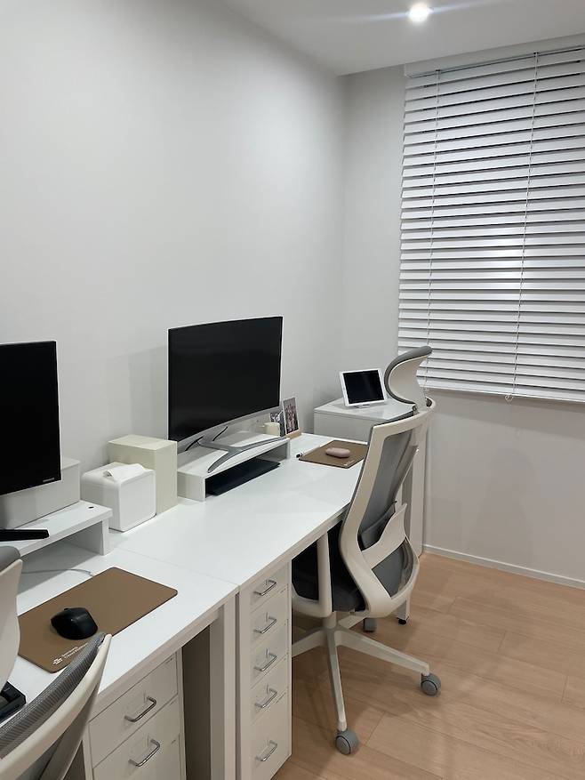 재택근무를 하는 저희 부부의 서재입니다. 최대한 심플하게 꾸며보았습니다.