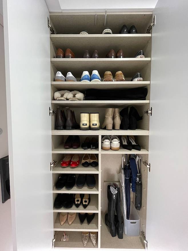 이전 집에서는 신발장 한칸, 한칸의 높이가 어중간하게 높아서 신발 수납 플라스틱을 두어 두짝을 겹쳐두곤 했었는데요. 이번 집에는 신발장 높이를 낮게 해달라 별도 요청을 하였습니다.